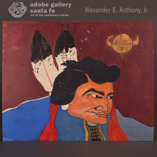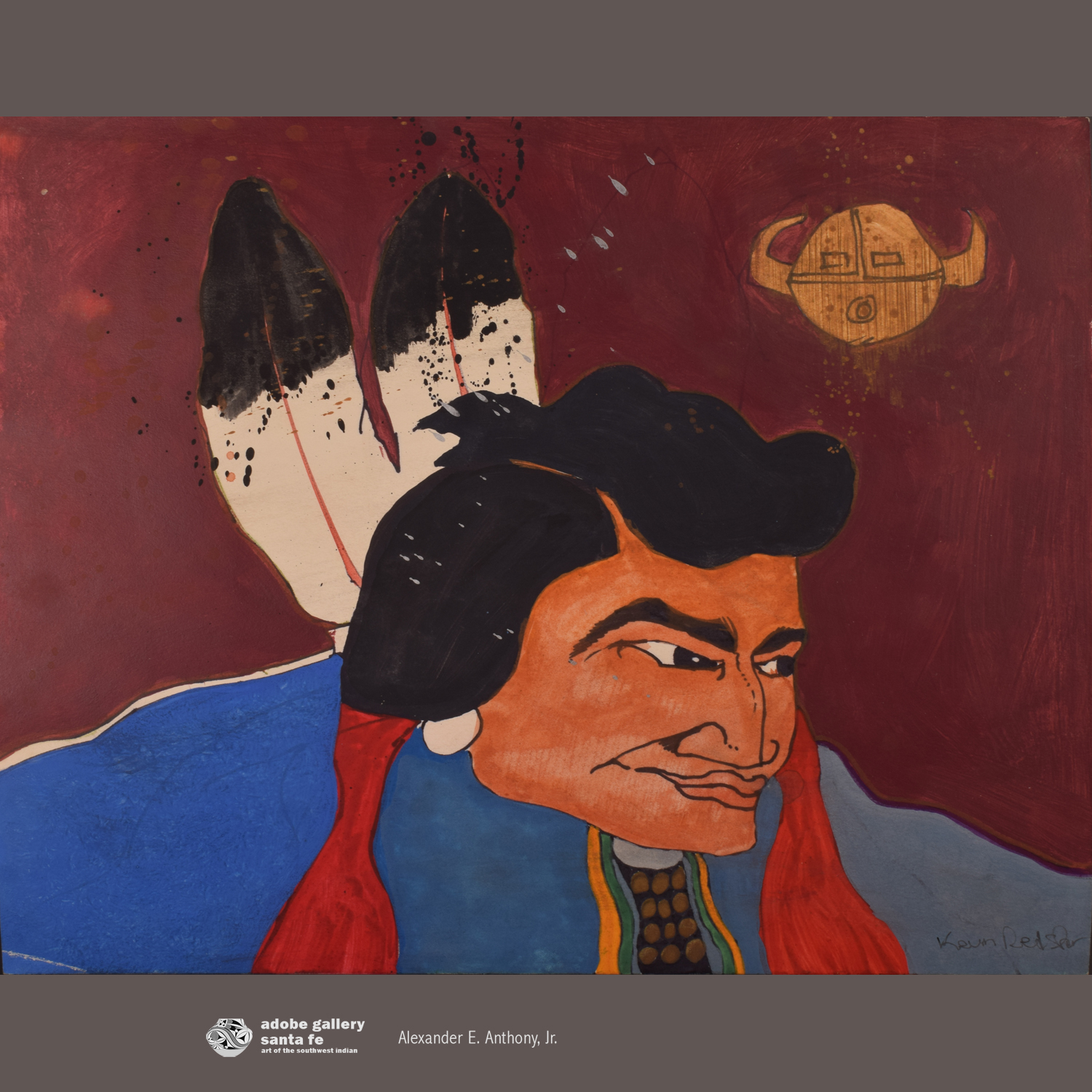 Kevin Red Star seems to have created many portraits like this one. What’s remarkable, though, is that each one of them is distinct. This one is particularly strong, with a wonderful maroon background and a tight, focused composition. Red Star’s subject here is a Native man wearing traditional clothing. He’s looking to his left, allowing the viewer to see his face in profile. His black hair and thick, long eyebrows leap out at the viewer. Most importantly, the man has a gentle, appealing presence that is hard to define but immediately noticeable. Above him is a Buffalo Moon symbol in yellow—a nice touch that we’ve not seen in similar images. The painting is unframed, and is signed “Kevin Red Star” in lower right.
