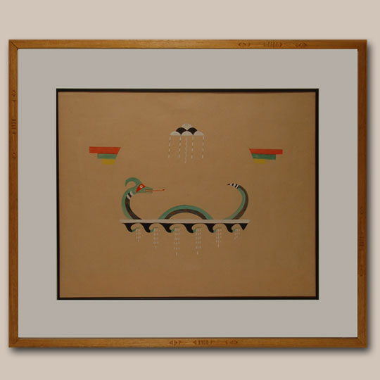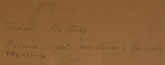 This painting on paper is titled in pencil on verso "Plumed Serpent - Rain Clouds & ¾ Circle" and signed Richard Martinez c.1927. Ink stamped on verso is Dr. Bertha P. Dutton, P. O. Box 5153, Santa Fe, NM 87501. In pencil by her stamped name is Ind. 35 Scheduled.