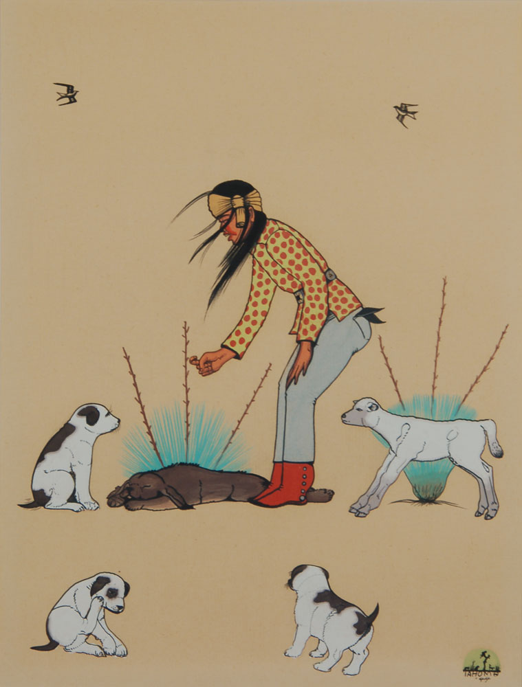In the early 1940s, when Tahoma painted this charming scene of a young Navajo boy surrounded by puppies and a sheep, the artist was at the height of his productivity and living a wonderful life. He was falling in love with an Easterner who had moved with her family to New Mexico and who lived on Canyon Road. The romance did not materialize, but the two-year courtship was good for Tahoma in that he was happy and productive in his art.