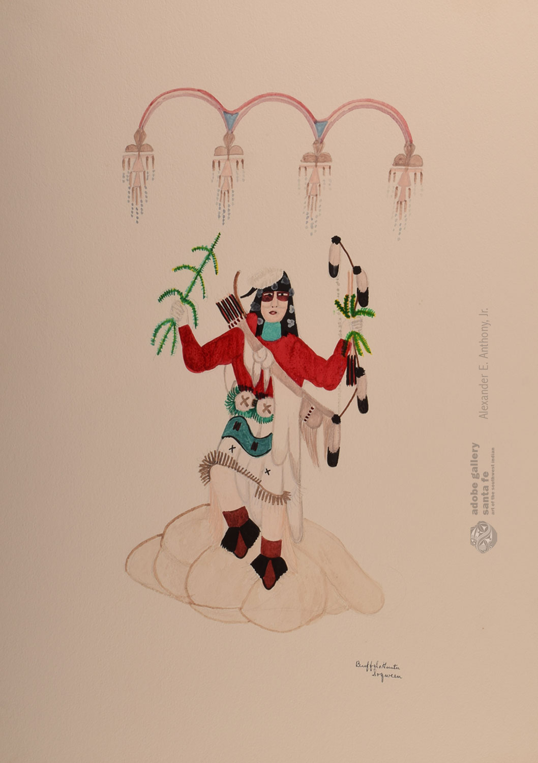 “Buffalo Dancer” proves that Tanner’s analysis of Soqween’s “typically puebloid” style was spot-on. The dancer dominates the paper, he’s pictured in the position described by Tanner, moving beneath a delightful set of abstract designs. Most notably unique is that he’s pictured directly, head-on, rather than in profile. This was Soqween’s preferred perspective, and it makes his unique and attractive paintings easily recognizable. While his peers usually depicted their dancers in great detail and in profile, which was how they were taught at the Santa Fe Indian School, Soqween’s work moved in a different direction. One could accurately describe it as primitive, and to do so would not be a slight—his are wonderfully simple compositions that possess an inexplicable charm. “Buffalo Dancer” is classic Soqween.