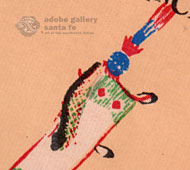 We have not handled many works by this artist, but the few we’ve had suggested that he was a skilled and versatile painter. His works often feature human figures that are clearly inspired by traditional Plains paintings. They’re placed within settings that are unusually elaborate, at least in comparison to earlier traditional works, which would feature little or nothing in the way of setting. The painting is signed Doc Tate Nevaquaya in lower right. It is framed in a carved wood frame, under a brown mat with interior bands in black and gray. Note: a descendant of the artist informed us that the painting is titled "Little Eagle Boy Dancer."