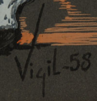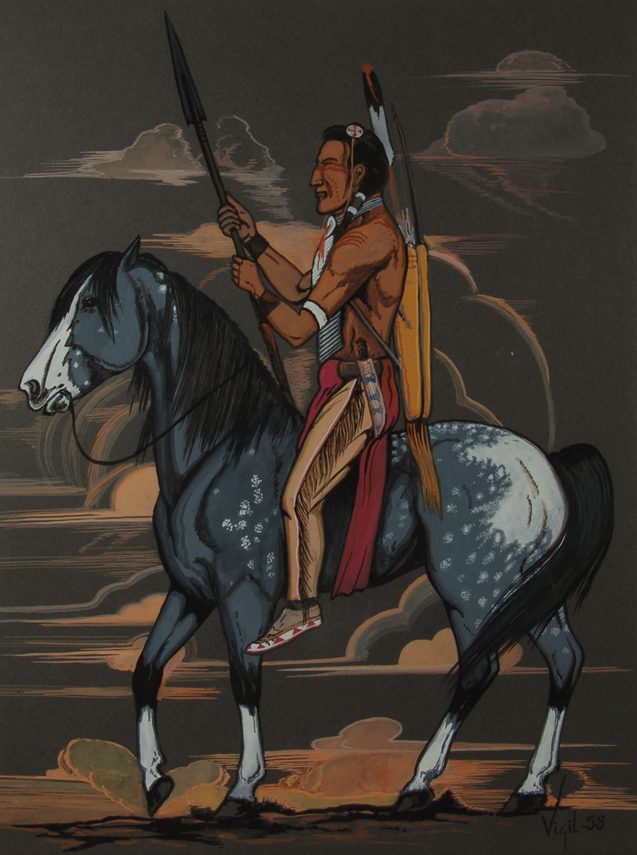 The painting is signed Vigil and dated 58 in lower right. It has just been framed using proper materials and a dark brown wood frame with a silver-toned fillet. The following is written in pencil by the artist on verso “The Warrior” Frank P. Vigil, Jicarilla Apache tribe, Dulce, New Mexico.
