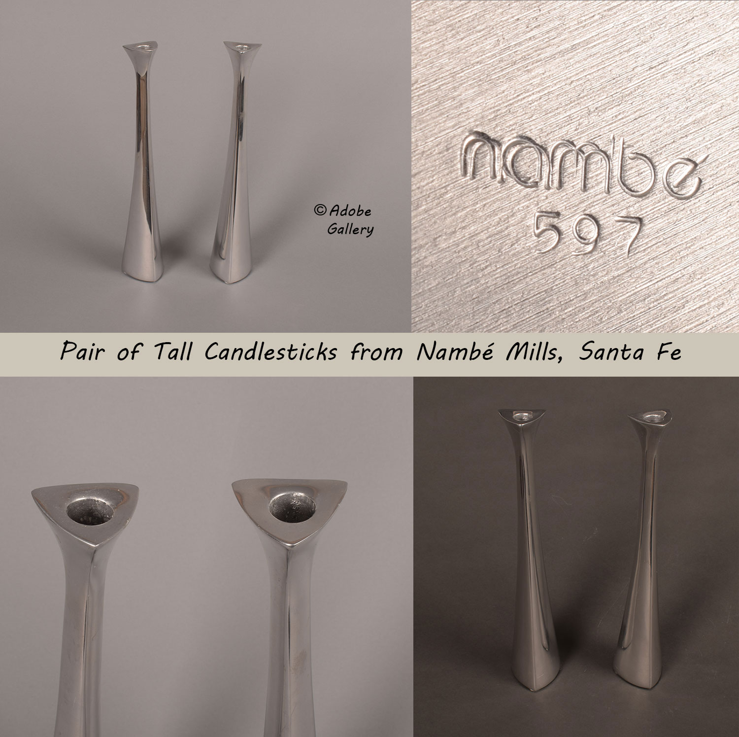 - This tall and elegant pair of Nambé candlesticks is labeled Nambe 597. They were cast when Nambé was casting its works in New Mexico, but now they are being cast in Asia.