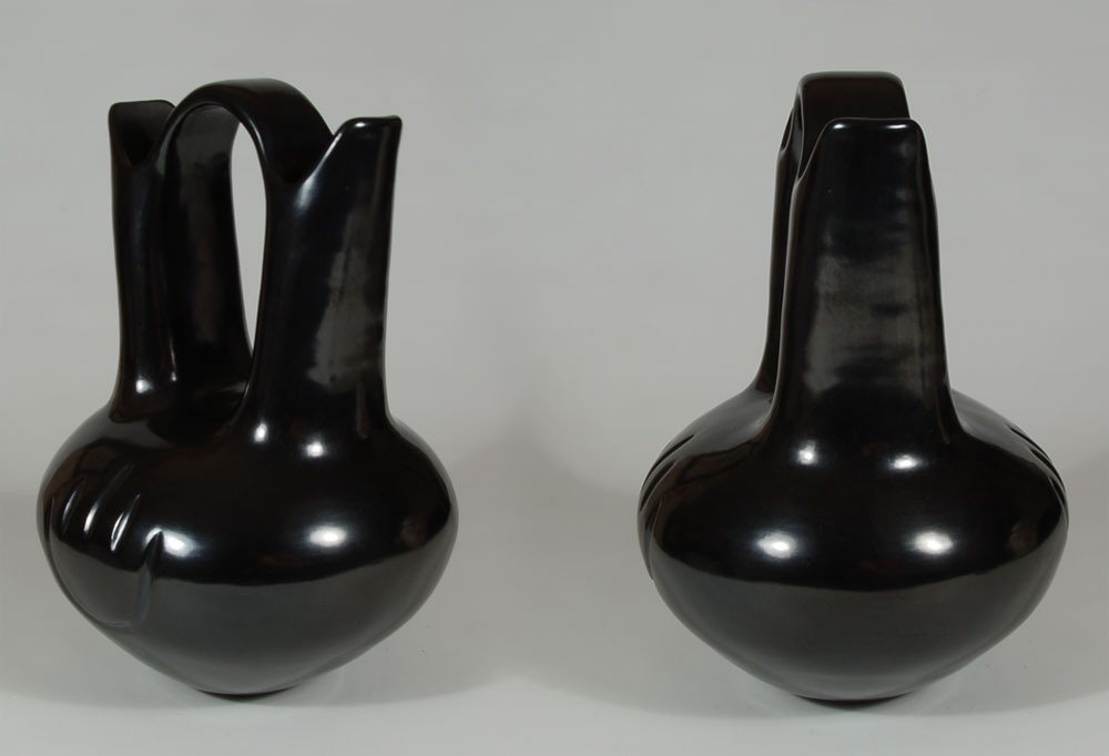 All of the Tewa-speaking pueblos of Northern New Mexico traditionally made blackware pottery during the historic period and most continued into the contemporary period. This includes San Ildefonso, Tesuque, Ohkay Owingeh, Santa Clara, Nambe and Pojoaque Pueblos. A black wedding vase of the style of this one would generally be the same whether it came from Santa Clara or Ohkay Owingeh Pueblo. Tina signed this one as being from Santa Clara Pueblo.