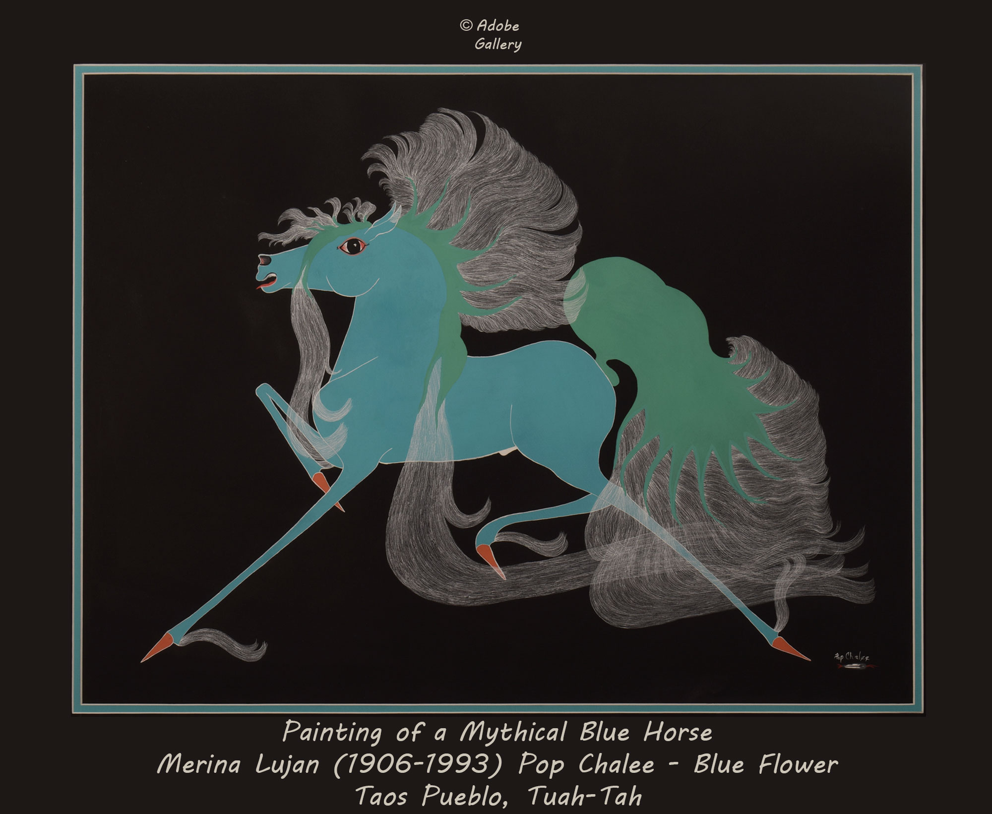An original painting by Pop Chalee of the Mythical Horse is one of the most iconic and prized of all her art. It is a watercolor on black paper. The horse is blue, the tail and mane are green with white hair. The beautiful mane and tail are amazingly detailed with each hair individually drawn. It is beautifully framed with acid-free mats and a silver wood frame. It is signed in the lower right with her name Pop Chalee and feather logo.