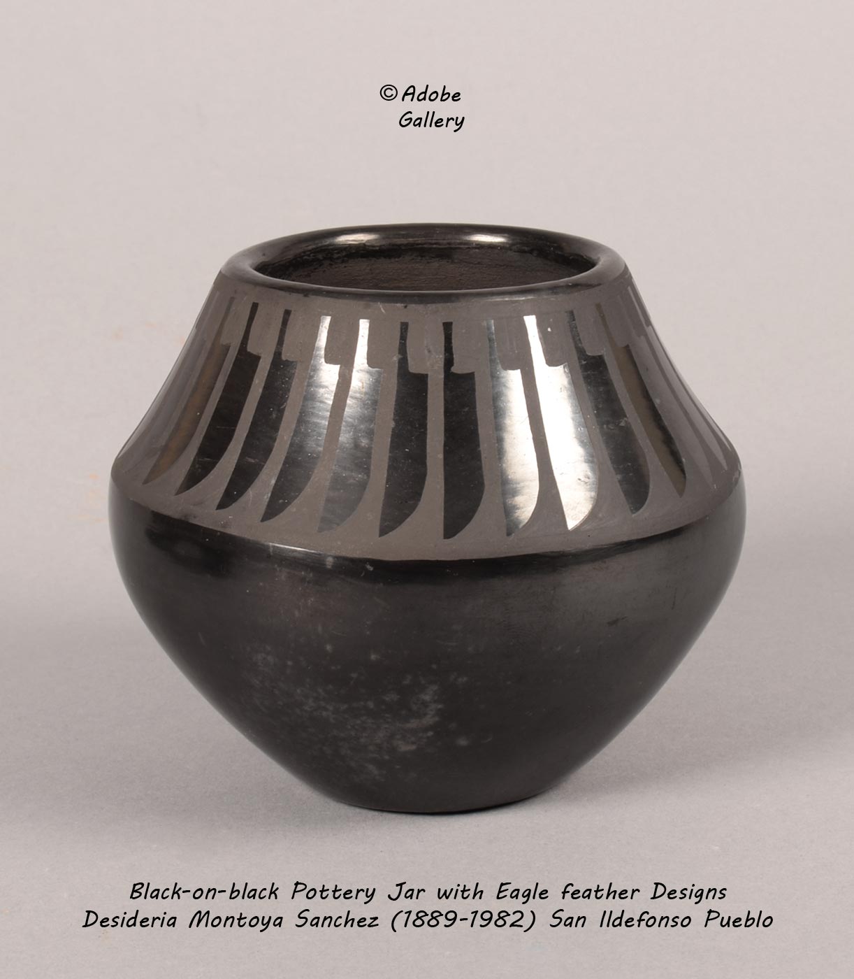 Provenance: this Black-on-black Jar with Eagle feather Designs by Desideria is from a client of Adobe Gallery