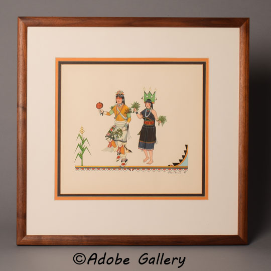 This beautiful painting of a male and female performing in the Corn Dance, was created by San Ildefonso Pueblo artist Gilbert Atencio. His works, while almost always traditional as far as subject matter goes, are instantly recognizable because of his exceptional technical abilities and keen eye for detail. This 1980 painting of two pueblo dancers is no exception. The dancers look about as real as possible with watercolors. Atencio honors the traditional style by focusing on the dancers and their clothing and expands on the style by successfully adding depth and detail.