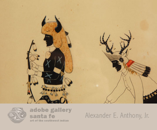 This San Ildefonso Pueblo Mixed Animal Dance painting of eight animal dancers is typical of the early works of Awa Tsireh, particularly those that were made in the 1920s. It is signed in lower right Awa Tsireh. It is watercolor on paper, and is framed with archival materials.