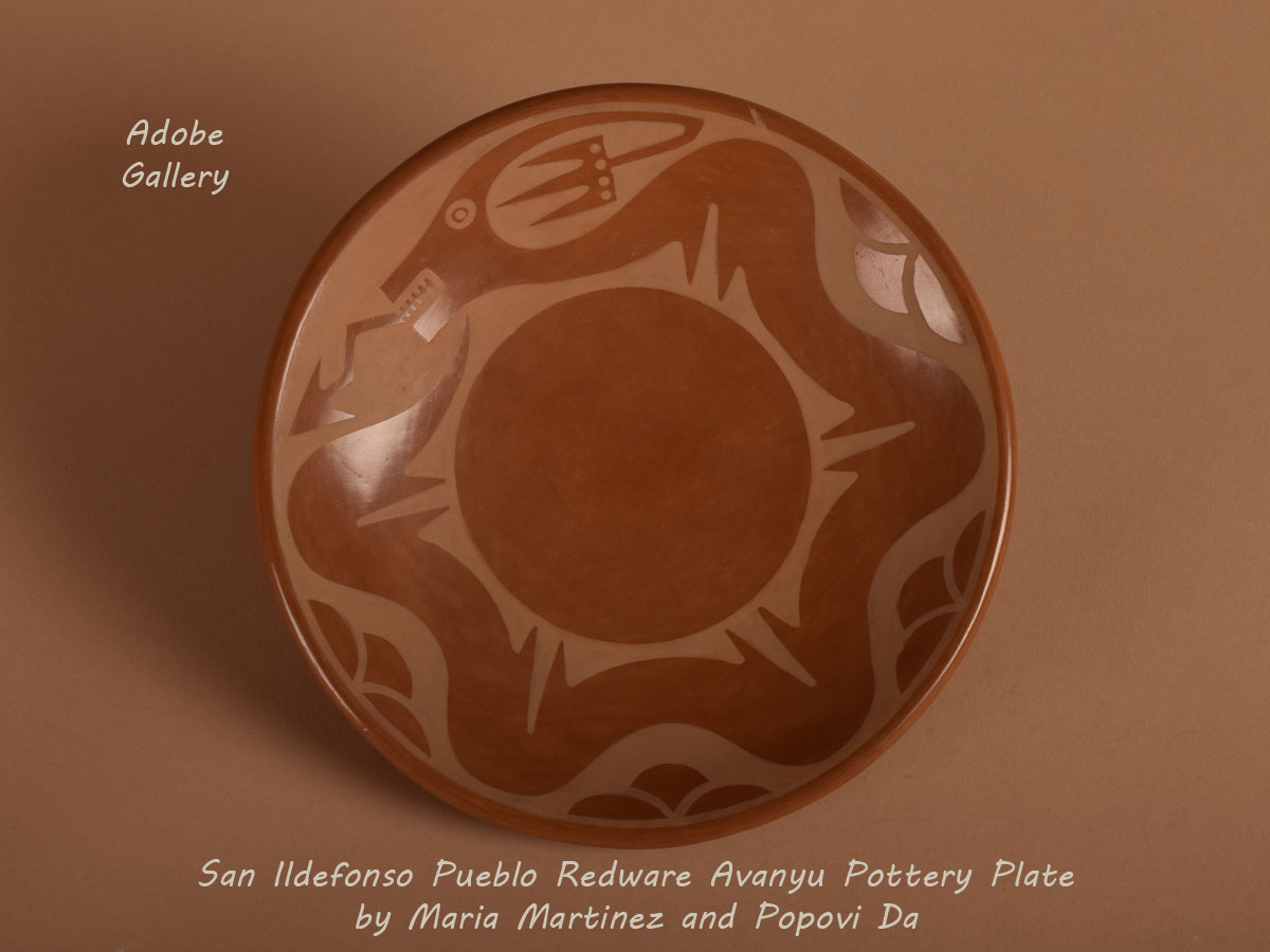 Provenance: this San Ildefonso Pueblo Redware Avanyu Pottery Plate by Maria Martinez and Popovi Da is from a private collection