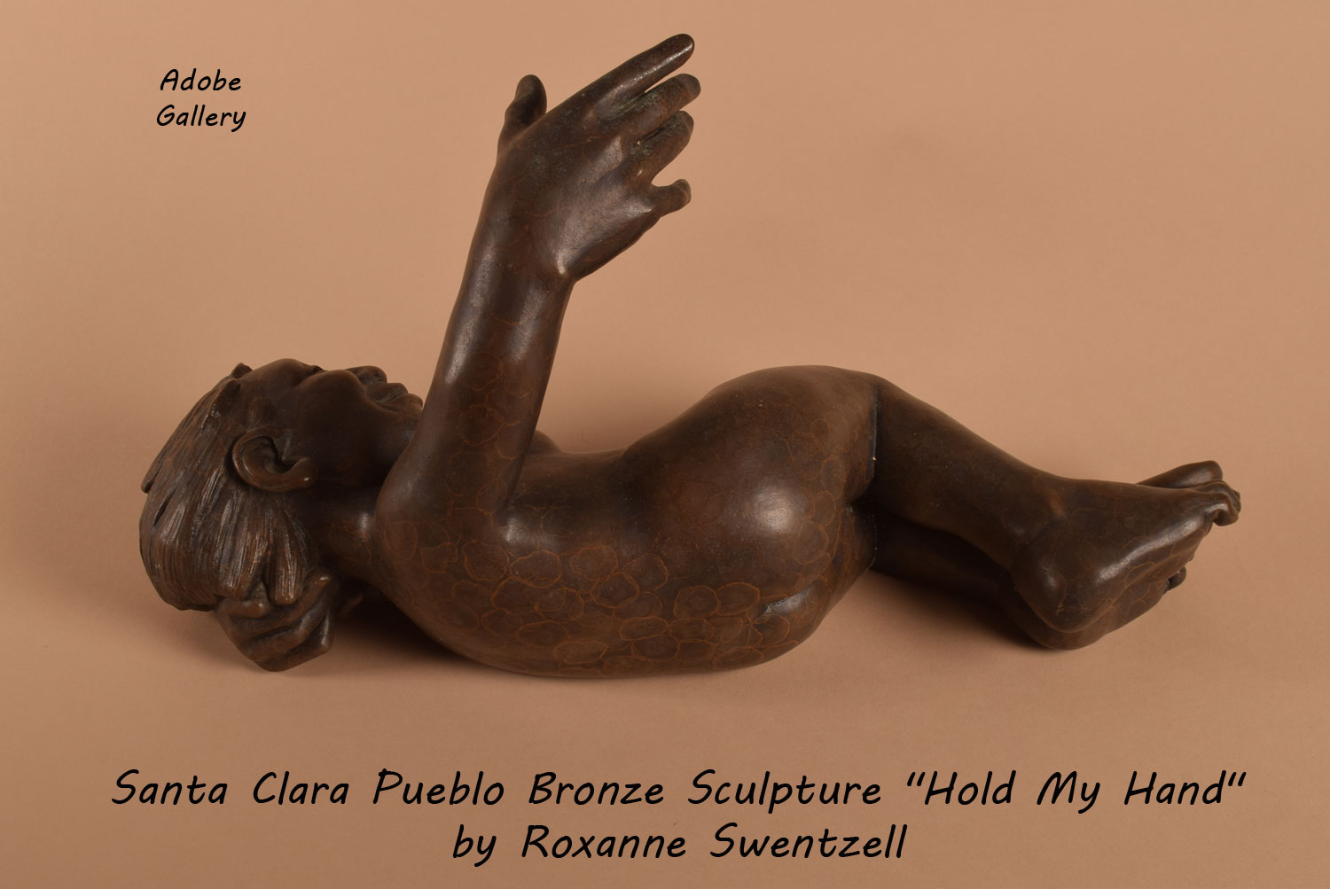 This bronze sculpture by Santa Clara Pueblo artist Roxanne Swentzell titled “Hold My Hand” was cast in an edition 20 and this is number 20. It was originally produced in June or July of 2001 by Roxanne’s sister Poem through Bright Foundry, Inc., Louisville, Kentucky.
