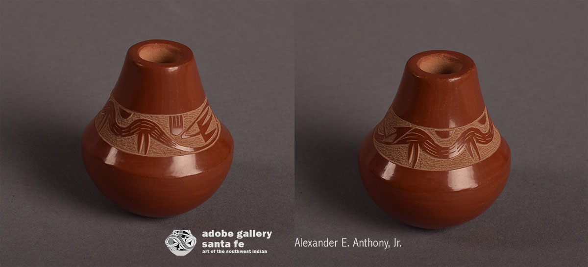 This Santa Clara Pueblo tall neck pottery jar is a very traditional Tewa vessel shape as seen in early pottery of the Northern New Mexico pueblos. This one by Art Cody Haungooah, however, is miniature in scale and modern in appearance. It was slipped in red clay and stone polished to a high sheen. An Avanyu was carved at the lower portion of the neck. The artist signed and dated the jar 1979.