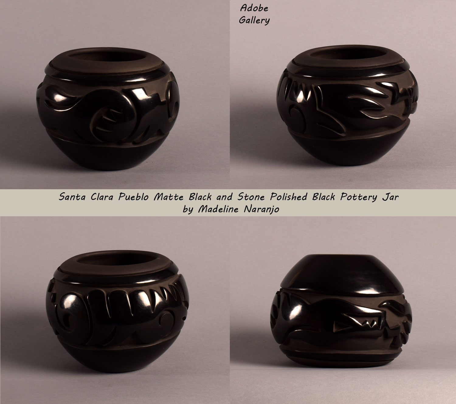 Provenance: this Santa Clara Pueblo Matte Black and Stone Polished Black Pottery Jar by Madeline Naranjo is from the estate of a family from New Mexico