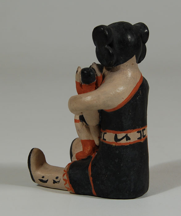 This miniature Seated Female Storyteller with Hopi Hair Style and Four Kids is wearing the hair style of a Hopi maiden, called a whorl hair style. She is dressed in the traditional pueblo dress which is cinched with a woven belt. She is holding three children in her arms and a fourth one sits on her lap. Three of the kids have their hands over their eyes and the fourth has his ears covered. It must be a scary story she is telling!