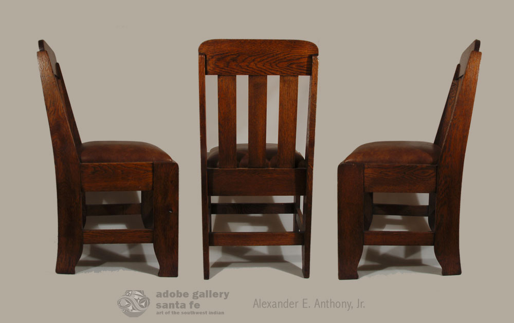 This armless Arts & Crafts Mission Oak chair does not display a manufacturer’s name. The legs are wide quarter sawn oak and the rear legs curve toward the back as they rise upward. There are three slats in the back.