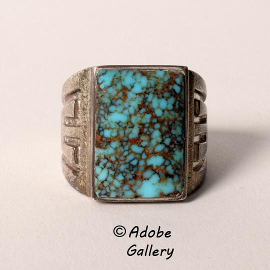 This late 20th Century silver ring features a large rectangular cabochon of turquoise set snugly in a simple straight edged bezel. A hook design was placed on the shank adding an elegant addition to the ring. It is a modern day example of the traditional Navajo aesthetic of making the focal point of a piece of jewelry the beauty of a single high grade stone. The ring is elegant and masculine. The ring is stamped SS for sterling silver. The artist's name is incised on the silver but we have been unable to decipher the name.  It was probably made by a Diné artist of the Navajo Nation.
