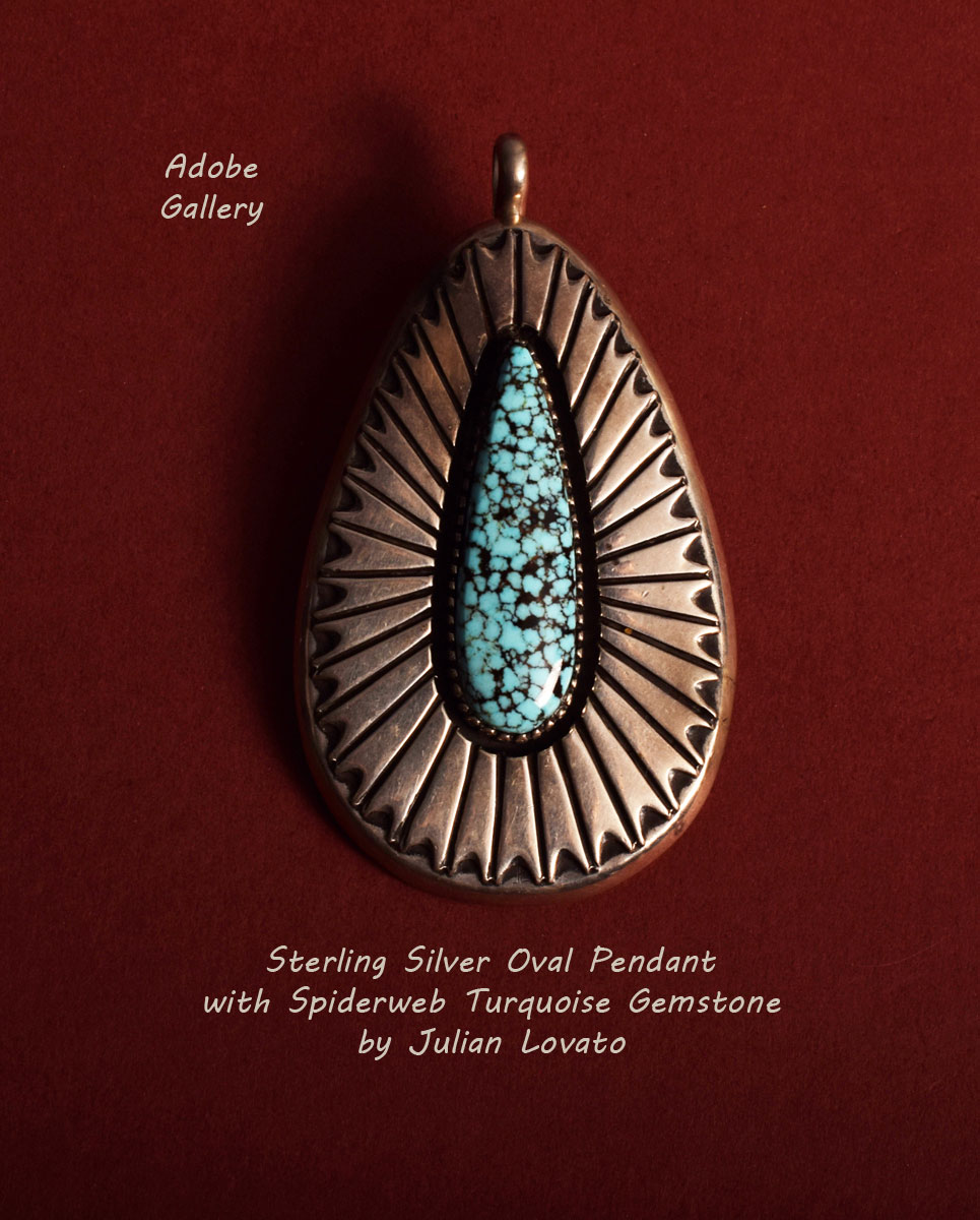Condition: this Sterling Silver Oval Pendant with Spiderweb Turquoise Gemstone by Julian Lovato is in excellent condition.