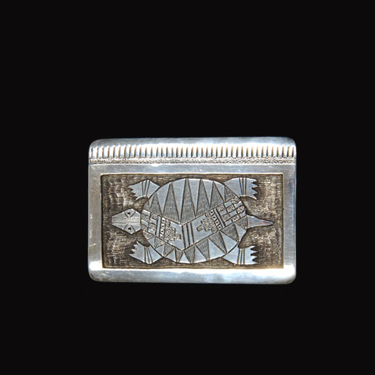 The turtle is the focal point of the buckle. The design on the turtle’s shell is intricate, part of which are triangles, side by side, alternating with some with fine lines and adjacent ones of plain silver. A wide band crosses in the center of the shell and it is very intricately designed with small rectangles, stepped elements and miniature circles. The detail can only be appreciated by close examination. The buckle is stamped with the artists’ initials RMT and a looped rope element.