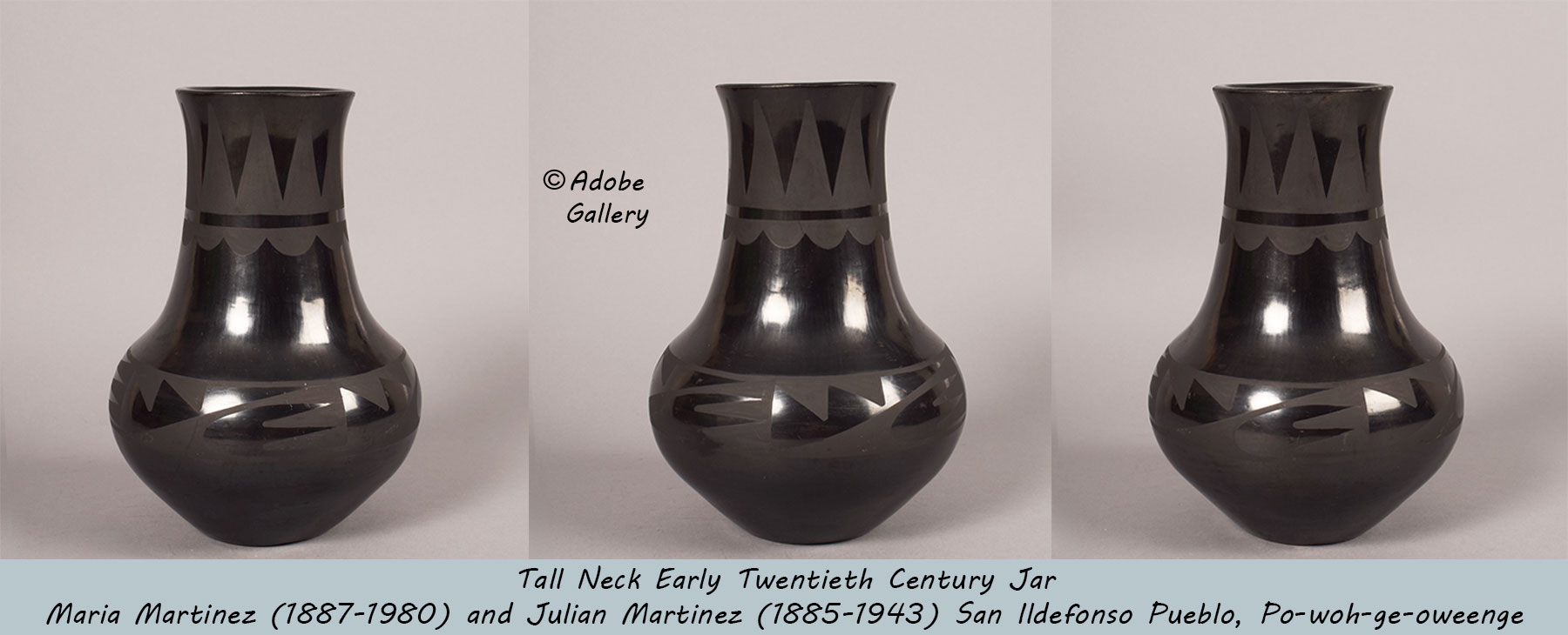 This magnificent Black-on-black jar is a seminal work by Maria Martinez (1887-1980) and Julian Martinez (1879-1943), the most influential duo in the history of Pueblo pottery.