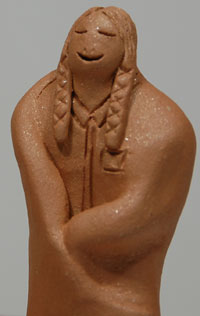 This nacimiento includes a kneeling female and a very tall male figure both in traditional Native American dress, the Christ Child in a bowl shaped manger, 2 lambs and a flat, clay backdrop depicting a horno by the side of an adobe house. The only designs are carved into the micaceous clay. The flat clay backdrop is signed J (Suazo) Du Bray and the female figure is signed J S du Bray.
