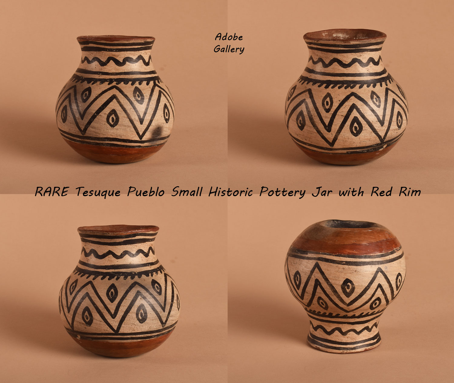 RARE Tesuque Pueblo Small Historic Pottery Jar with Red Rim [SOLD]