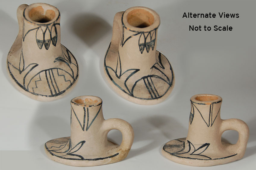 ![Southwest Indian Pottery | Contemporary | Tesuque Pueblo | Potter Unknown | Tesuque Pueblo Pair of Pottery Candlesticks label This pair of pottery candlesticks is Tesuque Pueblo by origin and features black outline designs left unpainted. It is not evident if the potter planned to fill in the design with color or if it was her intent to leave it as shown. There is an old fabric sticker on one that states Tesuque Indian Village Near Santa Fe August 18 1932. It is tempting to surmise that a tourist visited the home of a potter at Tesuque and saw and purchased this pair unaware that the painting was not complete. The potter was probably quite pleased to sell the pair as shown. Condition: very good condition Provenance: from the collection of a New Mexico family Recommended Reading: Collections of Southwestern Pottery: Candlesticks to Canteens, Frogs to Figurines [SOLD] by Allan Hayes, et al](https://www.adobegallery.com/uploads/25589-extra1.jpg)