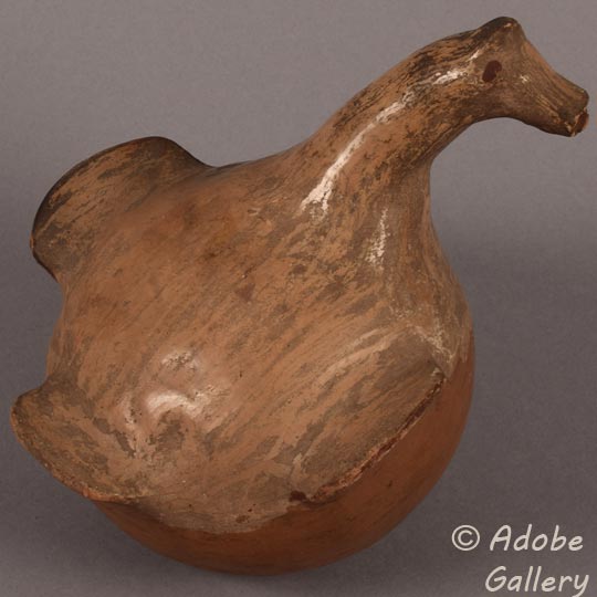 This bird effigy figurine from Tesuque Pueblo is one of the rare pieces from there. Figurines are not in abundance from Tesuque, except for the well-known rain god figurine. The figure is hollow inside and fashioned in the shape of a bird. It has small eyes painted with red slip, a crown on its head, and small wing and tail feathers protruding from the body. The upper body is polished light tan color, and the lower body is polished natural clay color.