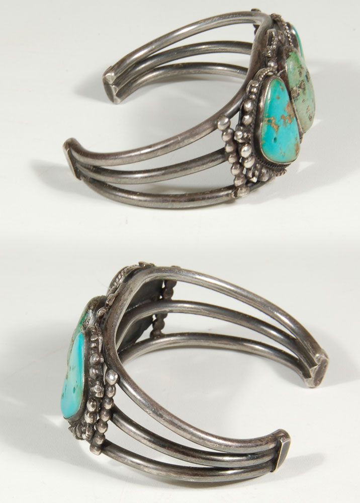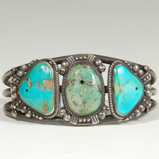 The framework of the bracelet is three round heavy silver wires spread apart at the top of the bracelet, soldered together at their ends, and capped with silver. The most amazing silver work appears on top of the bracelet surrounding each turquoise stone. Each stone is surrounded by silver rope at the base of the bezel. Individual silver drops have been combined into elaborate designs around each of the three stones to form an eye-catching display.