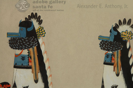 There is no doubt that Awa Tsireh attended the Zuni Shalako ceremonies at some point in his life, as did all other pueblo residents. Members of a pueblo regularly attended other pueblo functions and still do so today. That Awa Tsireh attended Shalako is evident in this painting. Most Shalako paintings by artists invariably show the Shalako, Mudheads and other participants of the ceremony in their ceremonial function. Awa Tsireh chose to paint three Shalako as they approach the Zuni Bridge from where they will begin the race that occurs on the last day of Shalako.
