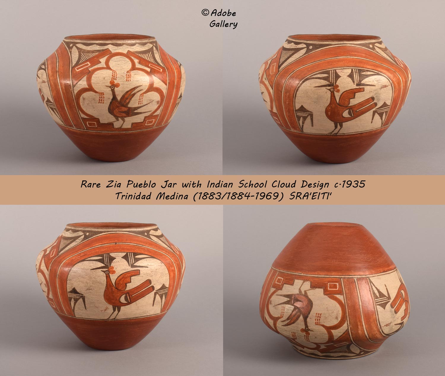 Provenance: this Trinidad Medina Rare Zia Pueblo Jar with Indian School Cloud Design c.1935 is from the collection of a client of the gallery