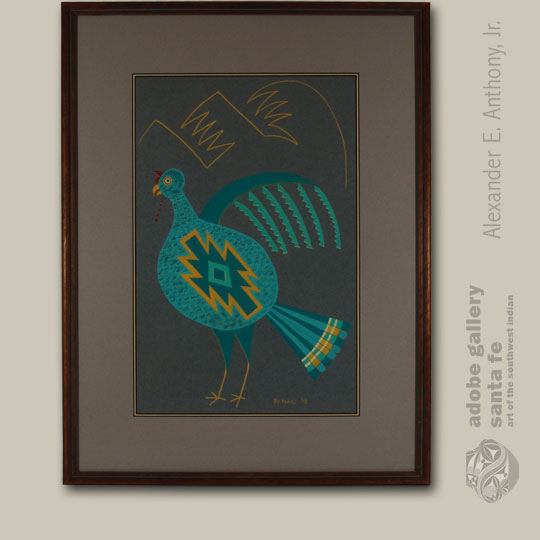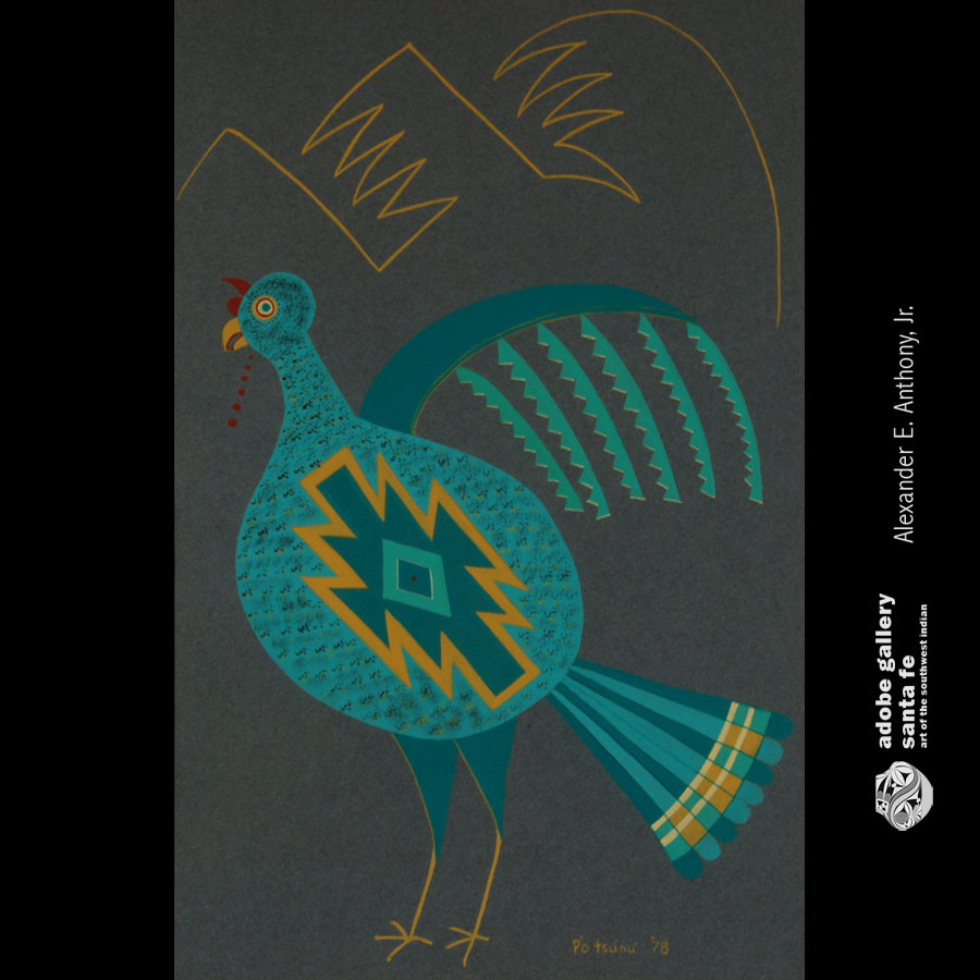 It is quite likely that Gerónima Cruz Montoya (1915 - 2015) P'otsúnú - White Shell thoroughly enjoyed painting this marvelous turquoise turkey. He was important enough to devote the whole area of the paper to his presence. A few streaks of yellow lines in the sky are his only companion. His waddle is composed of a few red dots, sufficient to declare the image to be that of a turkey, and no other bird.