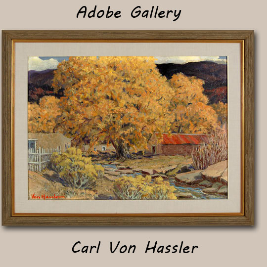 Carl Von Hassler was considered Albuquerque’s most famous artist and apparently quite an eccentric. When not producing oil paintings of adobe homes snuggled under massive cottonwood trees, he would hang out at the Franciscan Hotel bar in downtown Albuquerque visiting and chatting with others while imbibing. He strolled around town wearing a long cape, a beret and sporting a walking cane. His charm and eccentricities aside, he was an outstanding artist whose works have stood the test of time. He was most productive between 1930 and 1965.