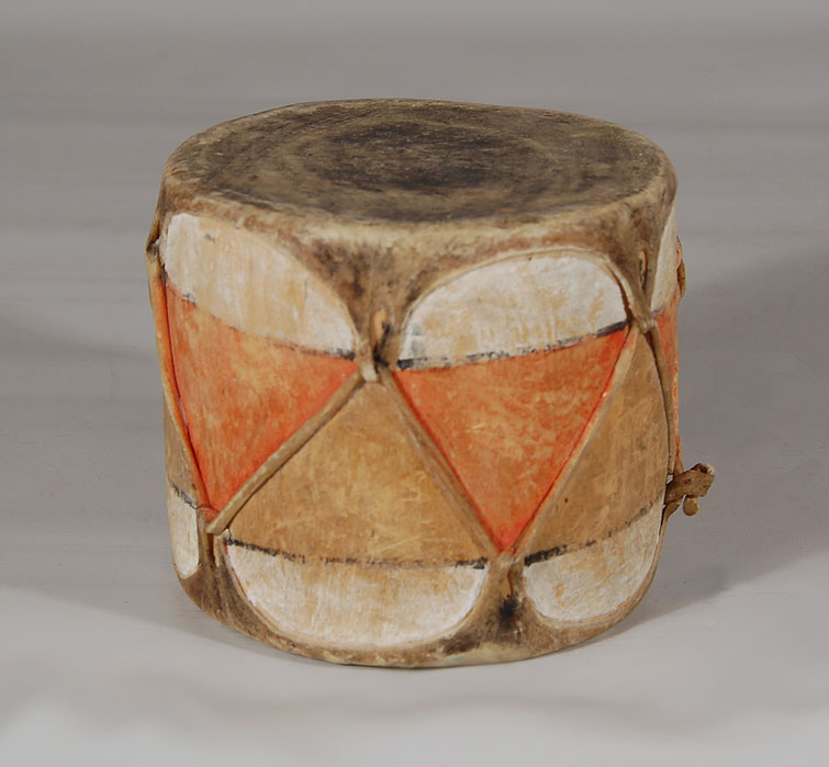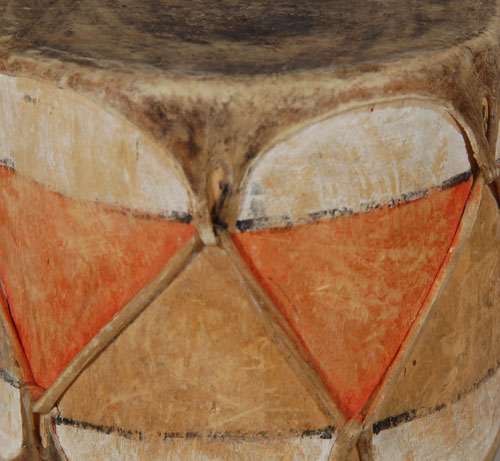 This very small drum is painted with red on alternating sections with the other sections not painted. The ends are white and the drumheads have a circle of black at their centers.
