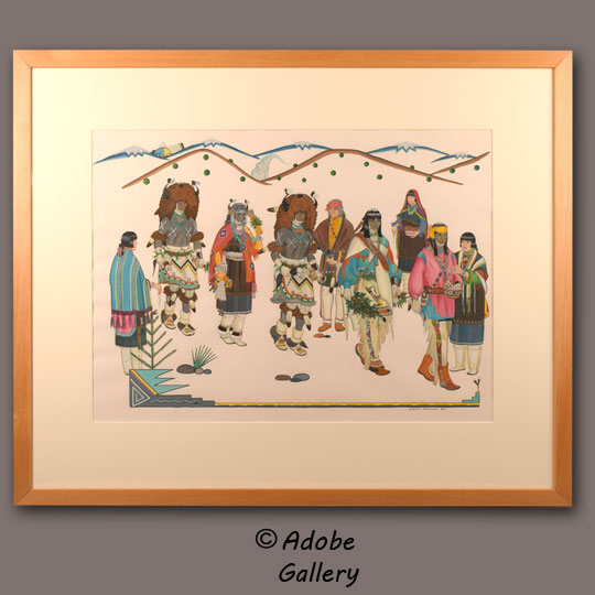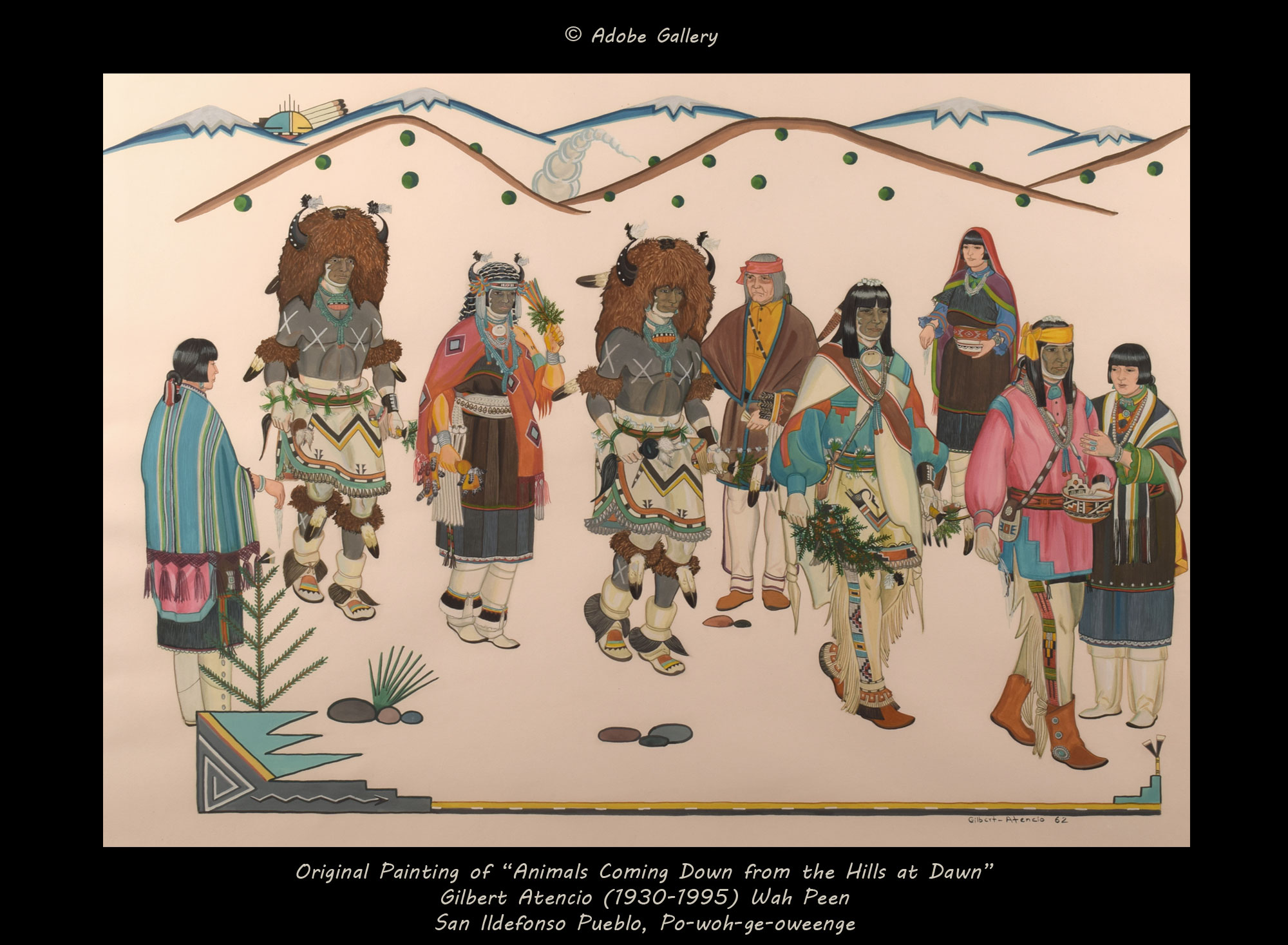 Gilbert Atencio will certainly be recognized as one of the finest Pueblo painters of the second half of the 20th century. He attended Santa Fe Indian School, graduating in 1947, and quickly gained acclaim, exhibiting at the Santa Fe Museum, the Gallup Inter-tribal Indian Ceremonial, and the Philbrook Art Center by the age of twenty.