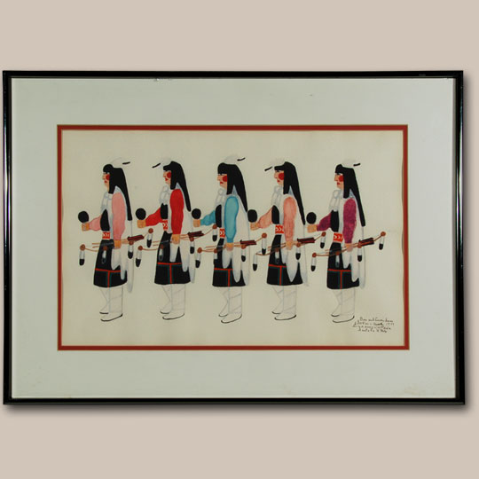 Only one of the paintings was framed, the remainder were not. We are presenting the framed one at this time. It is a painting of five Bow and Arrow Dancers in a procession line. Each of the women wears white buckskin leg-wrapped moccasins, the traditional black manta or dress with red and green yarn decoration, a red woven waist sash or belt, and each a colorful blouse. In their hands each carries a bow and arrows and each has a gourd rattle.