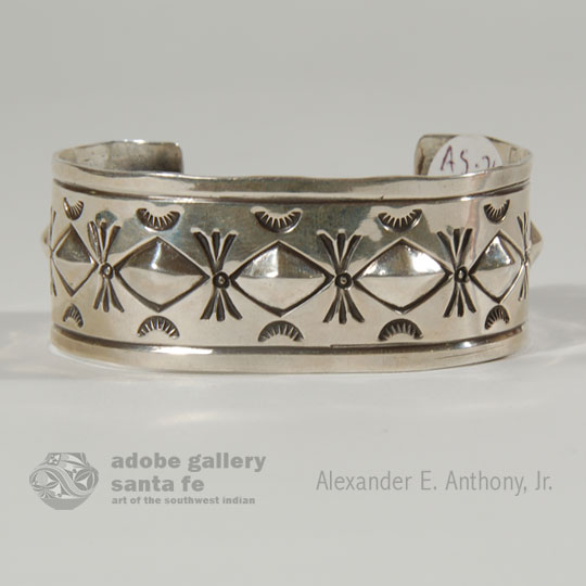 This wide silver band has raised diamond-shape protrusions running across the middle of the bracelet from end to end. They were punched outward from the back of the bracelet. The remaining designs were stamped from the front of the Wide Silver Band with Pyramidal Design bracelet. The name LEO is stamped on the back. The artisan has not been identified.