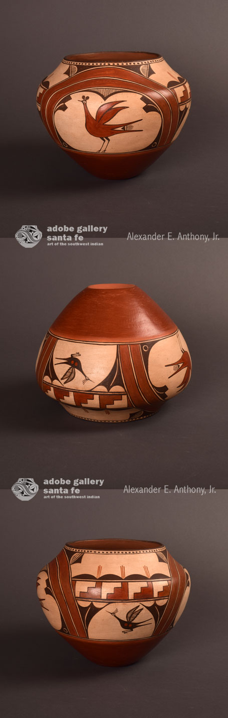 “Trinidad Medina was a diminutive person, standing just over 4 feet tall according to grandchildren and others who knew her. Nonetheless, she made some of the largest storage jars ever produced at Zia. They are also considered to be some of the finest. She received prizes and widespread recognition for her work, in part because the trader Wick Miller took her on road tours around the United States between 1930 and 1946. She demonstrated pottery making at the Century of Progress Exposition in Chicago in 1933 and possibly also at the San Francisco Golden Gate International Exhibition in 1939, where a least one of her large storage jars was shown.” (Harlow & Lanmon, 2003:285)
