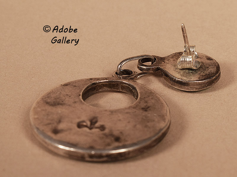 The fleur-de-lis hallmark on the earrings is a mark of Zuni Pueblo artisan Frank Vacit (1915-1999). Vacit sometimes collaborated with his wife, Elizabeth Leekya Vacit (? - 2005), the daughter of Leekya Deyuse, the most famous Zuni fetish carver of all times.