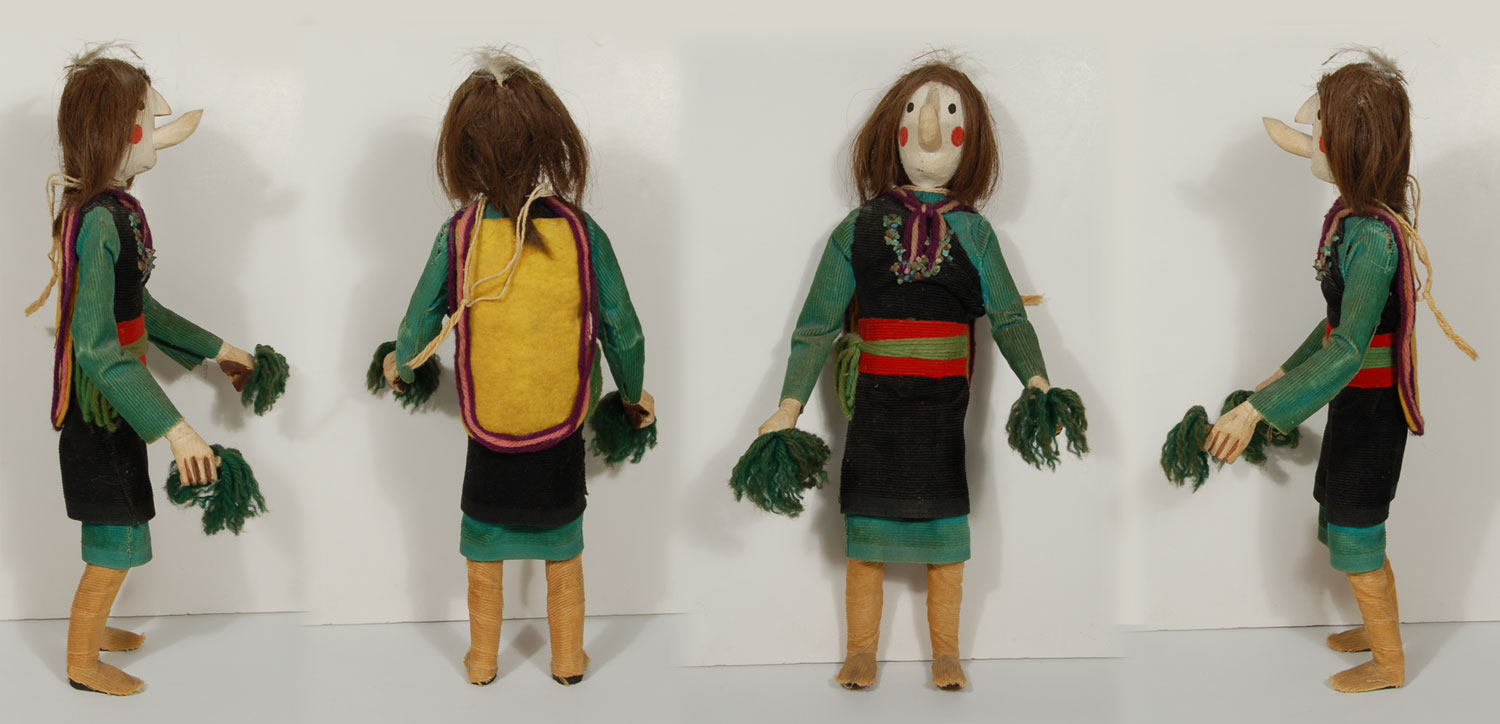 The Zuni Hemokatsiki, or Ahe’a Katsina Doll is the grandmother of all of the katsinas and she has a special relationship with her grandson Kolowisi. She is the only katsina that grows old. She is a dowdy old woman who is unkempt although she always seems to find clothes for katsinas when they come but never for herself.