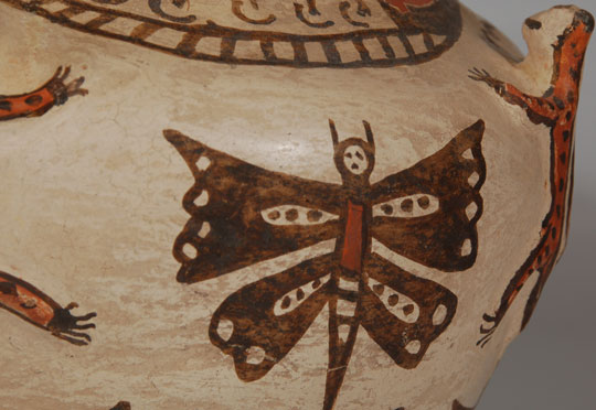 This jar is typical of the enthusiasm potters had to provide pottery that would appeal to collectors, tourists and museums. The more decoration, the better! Appliqué frogs near the neck of the vessel and plumed serpents around the neck were traditional design elements on both ceremonial and secular jars, but the addition of butterflies and tadpoles was an attempt to appeal to a sophisticated market, and it did. Jars such as this one were very popular with collectors and museums.