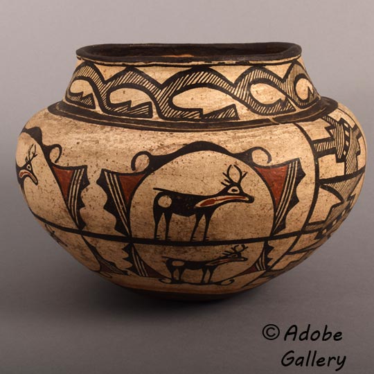 In transitional Kiapkwa Polychrome to Zuni Polychrome jars, the main body design was generally divided into two wide panels and two narrow panels, each divided by a wide vertical band. This jar is a typical Kiapkwa Polychrome to Zuni Polychrome transitional period jar-that is, it probably dates to 1870. The deer began to appear on the main body designs during the Kiapkwa Polychrome period in the 1840s and continued into the Zuni Polychrome eras.