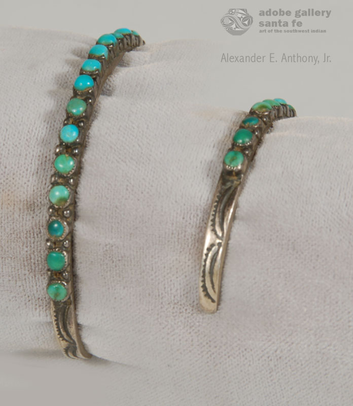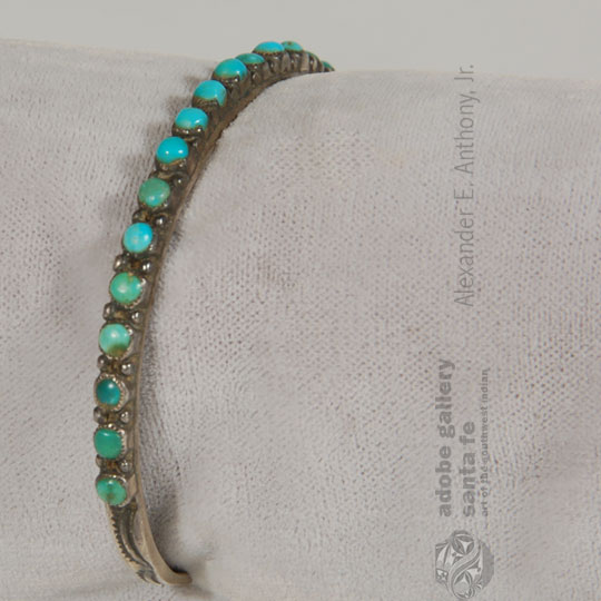 Very small, round turquoise stones are shaped and set in hand-made bezels to create this bracelet. Each small piece of turquoise is separated by even smaller sterling silver drops. This early single-row bracelet is a testament to the ability of Zuni Pueblo artisans to work with the smallest pieces of stone. The Zuni petit-point and needlepoint style got its name from the fine embroidery work that was popular at the beginning of the 20th century. Just as some women would spend hours sewing colorful designs with tiny stitches of thread, the Zuni used small stones to create designs to wear as jewelry.