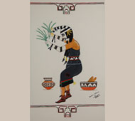 Religion is an integral part of Native life and it is incorporated into everyday activities, unlike other religions that are practiced only once a week. The Indians innate ability to sense the harmony of nature and to perceive its beauty as a religious phenomenon that pervades all phases of daily life is often portrayed in their art, as in this painting where Geraldine portrays a Tewa Clown (Koosa) performing a ceremonial offering or daily prayers with evergreen boughs in her hands. This Koosa is dressed as a female even though the impersonation is being performed by a male.