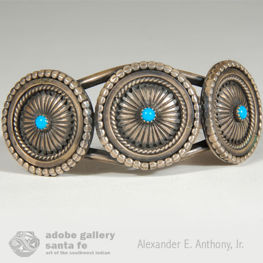 The foundation of this bracelet consists of three silver flat strips spread at the center and soldered at the ends. The foundation supports three silver conchas, each highly decorative and each with a small turquoise cab. The bracelet is stamped with the initials RB enclosed in a line drawing of a bear. This hallmark sign is not included in any of my hallmark reference books, so the artist is probably a young person who was not active when the books were compiled. The Silver and Turquoise Bracelet with Three Discs does have the look of being relatively new.