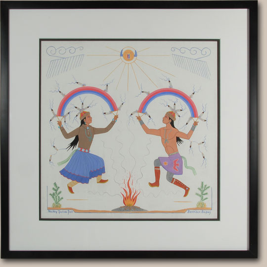Harrison Begay was a master at capturing the beauty and harmony of everyday Navajo life. Begay painted most of his life, having been trained in the 1930s at theSanta Fe Indian School. He continued throughout his life to paint the unique aspects of Navajo life and is considered one of the most influential Native American painters. In 1951, Begay became a co-founder of Tewa Enterprises in Santa Fe, a silkscreen printing company, because he wished to make his and other Native American art available to more people by making inexpensive prints from their original art.