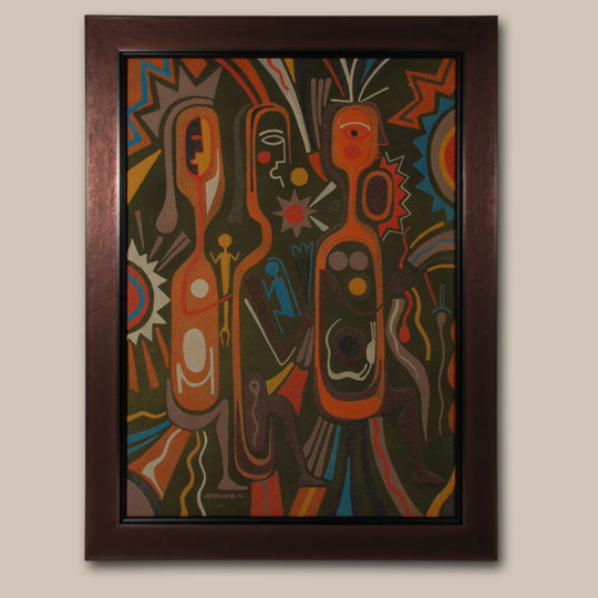 While in college, Paladin learned to experiment with mixing clay, sand, and mud to develop different textures to fashion his art. This painting has most likely been created using a mixture of sand and paint. Three figures that he designated as "Trinity in Sand" are the predominate elements of the painting. They are surrounded by a variety of shapes that fill the voids of the painting. It is an amazingly beautiful mixture of texture, color and shapes.
