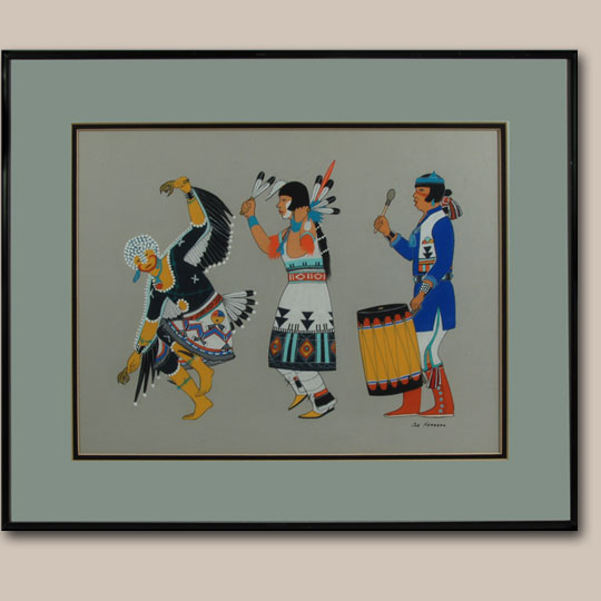 Joe Herrera, born into a rich art inheritance through his father's pueblo of Cochiti and his mother's pueblo of San Ildefonso, was painting before he entered the Indian School in Santa Fe. His mother, Tonita Peña (Quah Ah) gave him thorough training in art techniques.