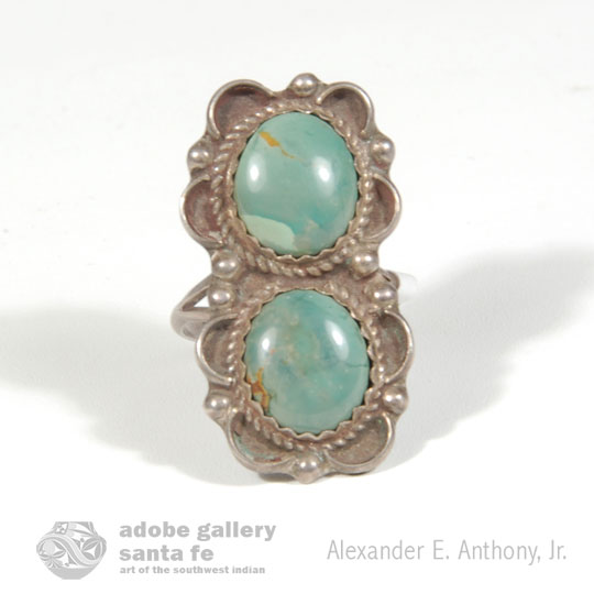 The green turquoise cabs in this Sterling Silver and Double Turquoise Ring have an opalescence like opals. It is as if one could see into the stone, past the face, into its depths. The green stones are beautiful. The silverwork surrounding the pair of turquoise cabs form semicircles on the edges and are then separated by silver dots. Each turquoise cab is surrounded by silver twisted wire.