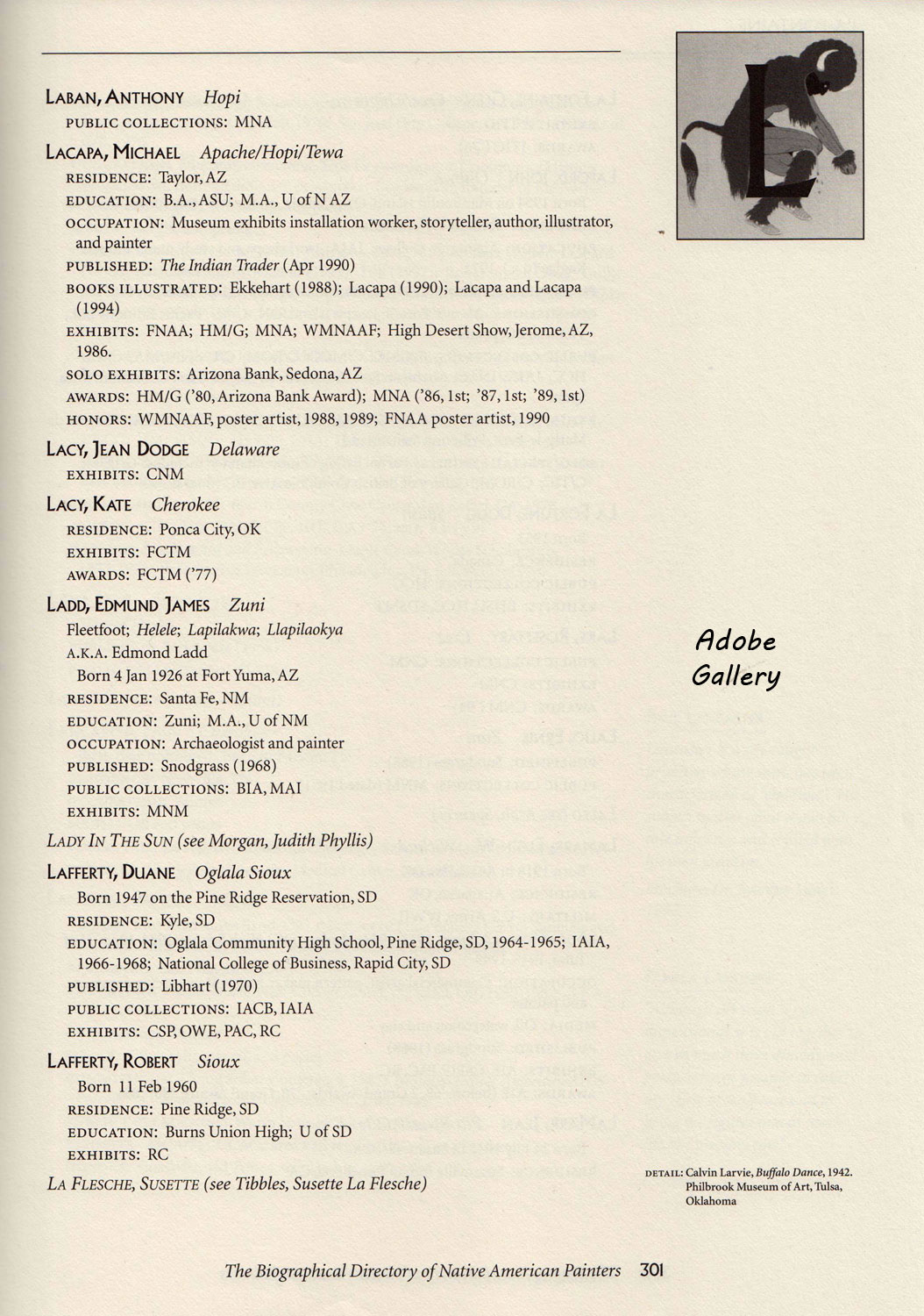 Typical entries list the artist's tribal affiliation and tribal name, birth and death dates, residence, publications, exhibits, awards, and honors. Brief passages of human interest complement the biographical information. Excerpts from professional reviews and critical essays are also provided.