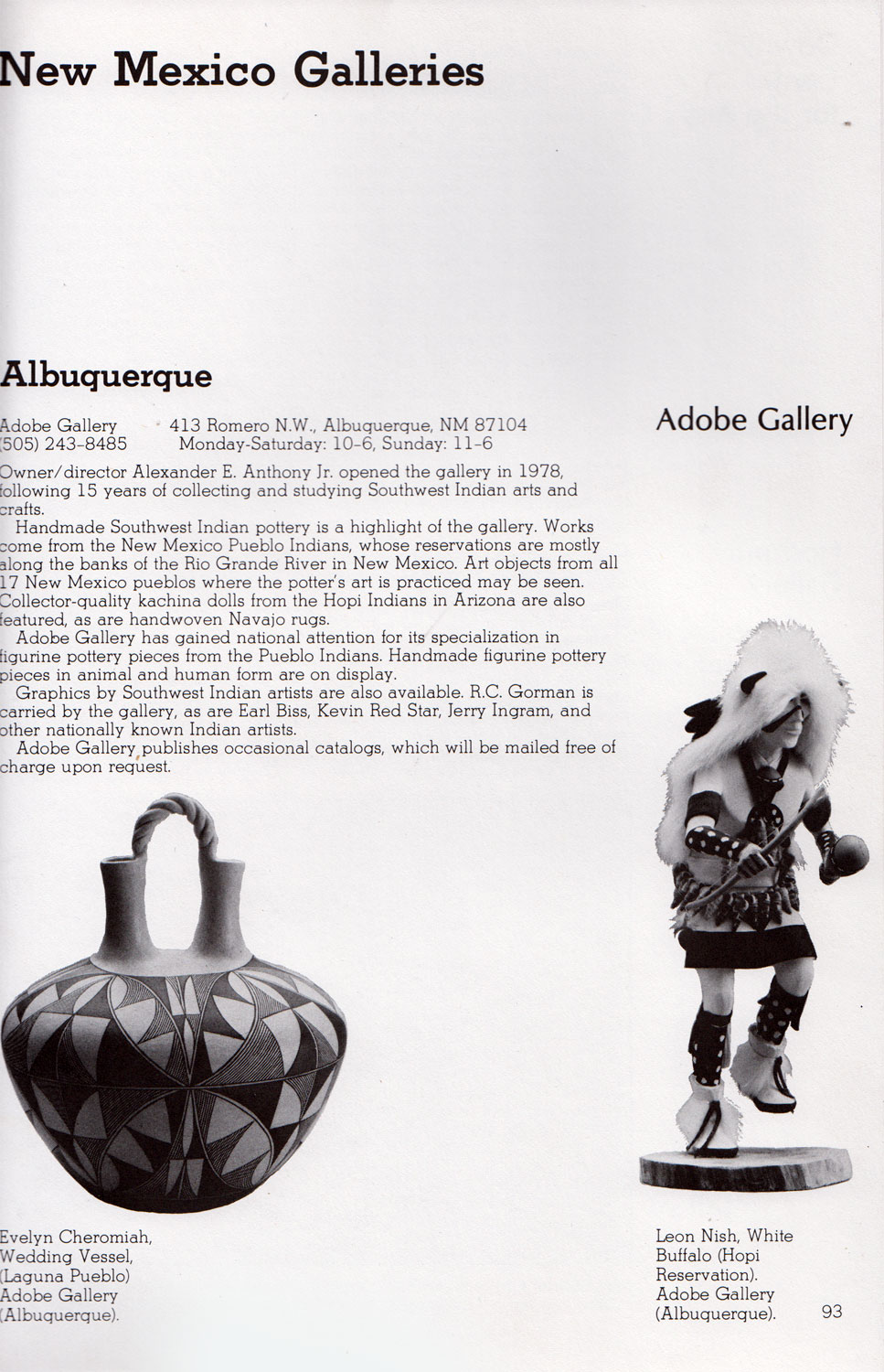 Photographs of appropriate art pieces are shown with each listing as an example of what one might see at that museum or gallery. It is quite enjoyable to see some of the Santa Fe galleries that were once here and are no longer. This is a wonderful documentary of what it was like over 35 years ago. I am pleased to see that Adobe Gallery in Albuquerque was included as we had only been open for 4 years and certainly were not a major gallery at the time.