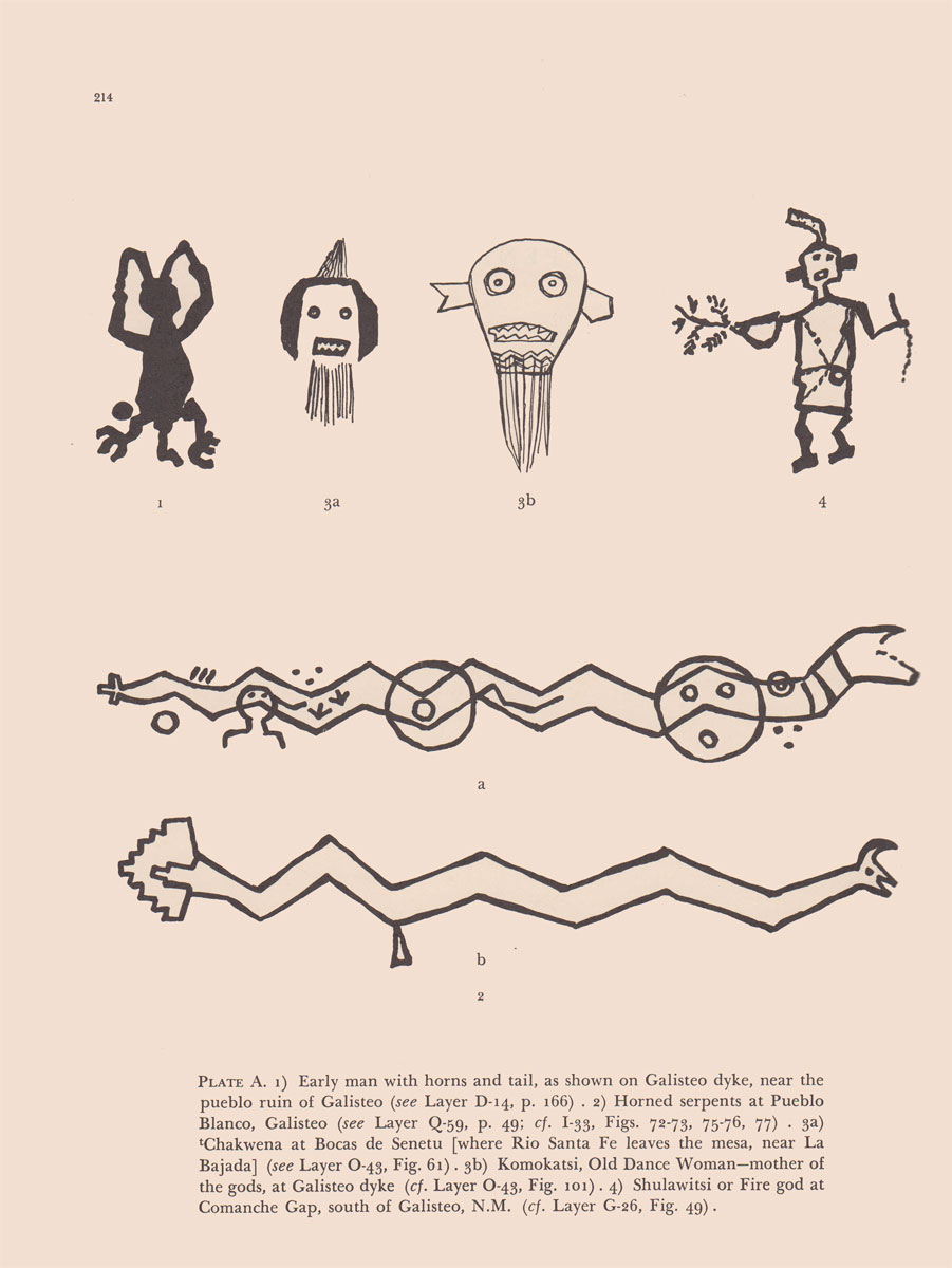 “During the excavations at the ruin site known as Kuaua, on the west bank of the Rio Grande near Bernalillo, New Mexico, routine digging was under way in the south plaza, preparatory to bringing a phase of the work to its conclusions. Suddenly, dull toil shifted to alert interest. With the dirt thrown onto a wheelbarrow, there appeared fragments of plaster covered with flecks of color. The archaeologists in charge began careful investigation with a small trowel, soon revealing the outstretched fingers of an upraised hand painted on the wall of a subterranean chamber. Interest changed to excitement. Then a grotesquely masked head was brought to view, and finally an entire figure. This proved to be one of many depictions painted on the wall of a square room. There was not one decorated surface only, but evidence of many similar ones.”